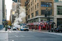 Fifth Avenue met een zijstraatje in New York, een typisch beeld van Manhattan met stoomwolken die uit de straat omhoog komen.