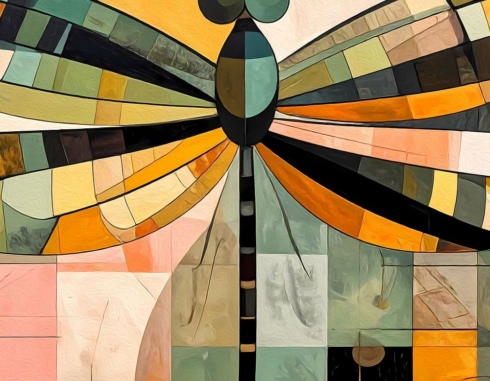 Een figuratief kunstwerk van een libelle in aarde tinten, roze oranje bruin groen en blauw. Semi abstract kunstwerk dat goed past in een landelijk of modern interieur.