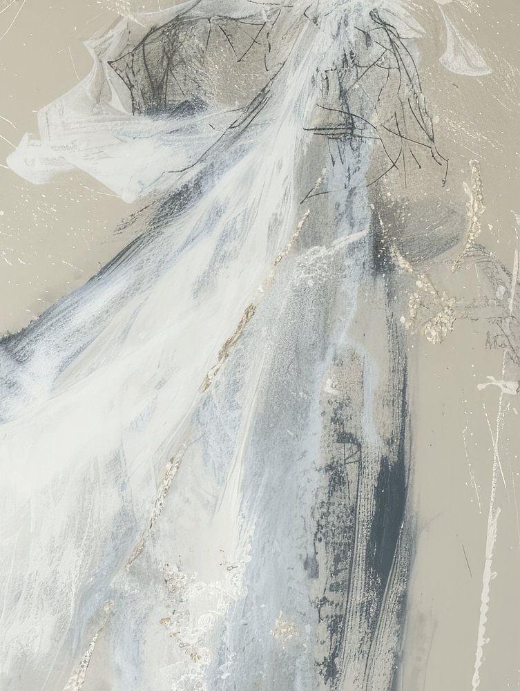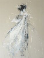 Figuratief portret in Japandi stijl. Portret van een jonge vrouw op de rug gezien in blauw, zwart, wit en een vleugje goud. Een echte blikvanger voor je interieur!