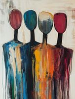 Figuren schilderij | Abstracte mensen in kleur - In dit abstract schilderij zie je vier gestileerde mensen met verschillende kleuren hoofden en lichamen, die samen een interessante en dynamische uitstraling creëren met een speelse en moderne stijl.