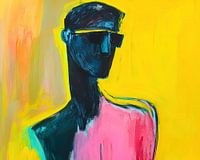 Figuur | Contemporary Cool - Dit abstracte schilderij toont een gestileerd figuur met zonnebril, uitgebeeld in vetgedrukte, expressieve penseelstreken en levendige contrasterende kleuren zoals geel, blauw en roze.