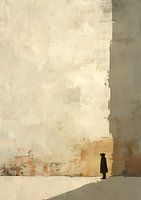 Figuur in jas | Abstract schilderij met figuur in jas - In dit abstract schilderij zie je een figuur in een donkere jas die staat tegen een achtergrond van warme aardetinten en beige, wat een gevoel van eenzaamheid en contemplatie oproept.