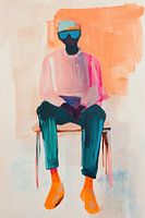 Figuur met Bril - Dit abstracte schilderij toont een zittende figuur met een helder oranje-bril en bijpassende sokken, vervaagd op een ongedefinieerde pastelachtergrond.