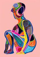 Figuur met Kleuren | Abstracte Menselijke Vorm - In dit abstract schilderij zie je een kleurrijke figuur in een dynamische pose, met opvallende ronde en golvende vormen, tegen een zachte roze achtergrond.