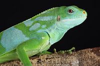 Een portret van een Fijileguaan. Deze kleurrijke leguaan komt alleen voor in de tropische bossen van Fiji en Tonga. Deze soort leeft op een enorm afgelegen plek en er wordt gedacht dat deze soort geëvolueerd is uit de Groene Leguaan, welke door middel van drijfhout de Grote Oceaan is overgestoken