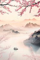 Zachte pastelkleuren worden gecombineerd met delicate kersenbloesems en majestueuze bergen, terwijl een kalme boot op spiegelglad water drijft. Dit harmonieuze landschap straalt vrede en rust uit, perfect voor een slaapkamer of meditatieruimte om een sfeer van ontspanning en innerlijke rust te creëren.