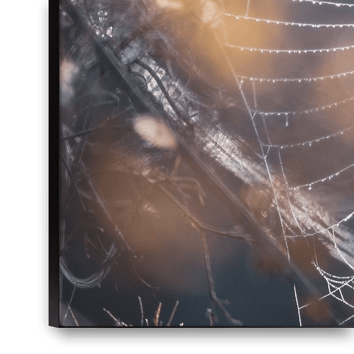 Delicaat met dauw bedekt spinnenweb, verlicht door de vroege ochtendzon. Magisch licht dat weerkaatst op de omringende hortensiabloemen in een wintertuin. Zachte tinten blauw grijs en oranje. Kunstwerk met neautrale tinten en rustgevende kleuren, ideaal om op te hangen in een wachtkamer, of zelfs een gezellig hoekje in de woonkamer.