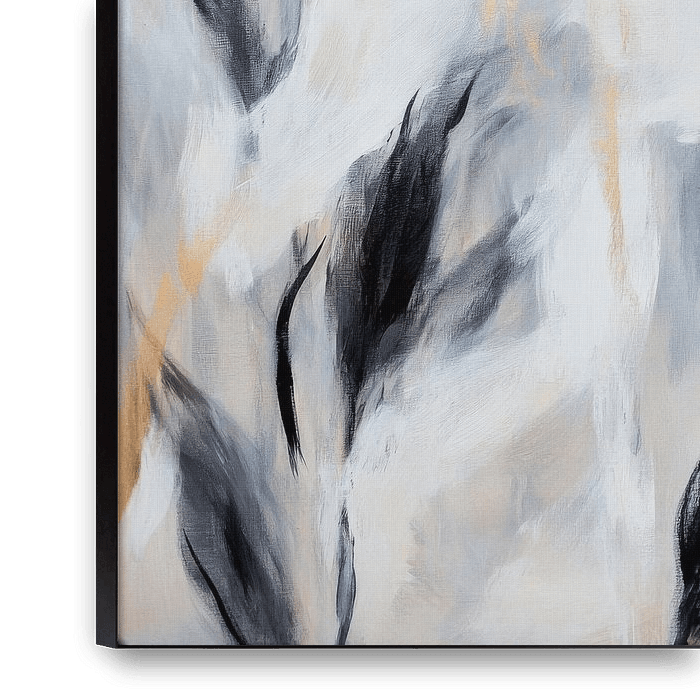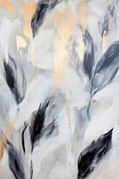 Een poëtische compositie van fijne bladeren zweeft in zachte tinten grijs en delicaat goud, schijnbaar dansend in de wind. Hun delicate contouren nodigen de kijker uit om zich onder te dompelen in een dromerige sfeer, terwijl de gouden glans een vleugje elegantie en warmte toevoegt. Een harmonieus samenspel tussen lichtheid en diepte.