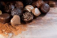 Fijne chocoladepralines op cacaopoeder als liefdesgeschenk, hoekachtergrond met kopieerruimte op rustiek hout, geselecteerde focus, smalle scherptediepte