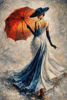 Dit werk vangt een moment van stille elegantie en innerlijke kracht. De vrouw, gezien van achteren, beweegt zich moeiteloos door een abstracte ruimte waar licht en textuur samensmelten. Haar vloeiende jurk lijkt bijna op te gaan in de omgeving, terwijl de diepe blauwtinten rust en verfijning uitstralen. Het warme rood van de paraplu…