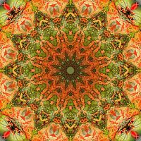 Een twaalfpuntige ster met kleuren en vormen die enigszins doen denken aan de tijd van de Jugendstil maar gebaseerd zijn op een foto van de bladeren van een esdoorn in de lente.