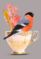 Deze fantastische goudvink zit zo gezellig op een zachtroze kopje met gouden patronen. De bloemen of bloesem is in dezelfde zalmroze kleur als de vink en het theelepeltje is ook goudkleurig.