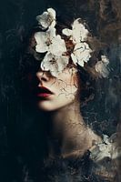 Een artistieke compositie waar witte bloesems versmelten met een gebarsten textuur tegen een donkere achtergrond. De rode lip vormt een krachtig accent in het geheel, terwijl de bloemen lijken te verweven met de broze, gebarsten structuur die over het beeld kruipt. Het spel tussen licht en donker creëert een sfeer van vergankelijke schoonheid en poëtische melancholie.