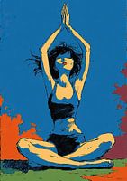 Finding Balance in Every Breath - Dit yoga schilderij toont een vrouw in een meditatieve houding met opgeheven handen, omringd door een levendige blauwe achtergrond die de serene en positieve energie van yoga oproept.