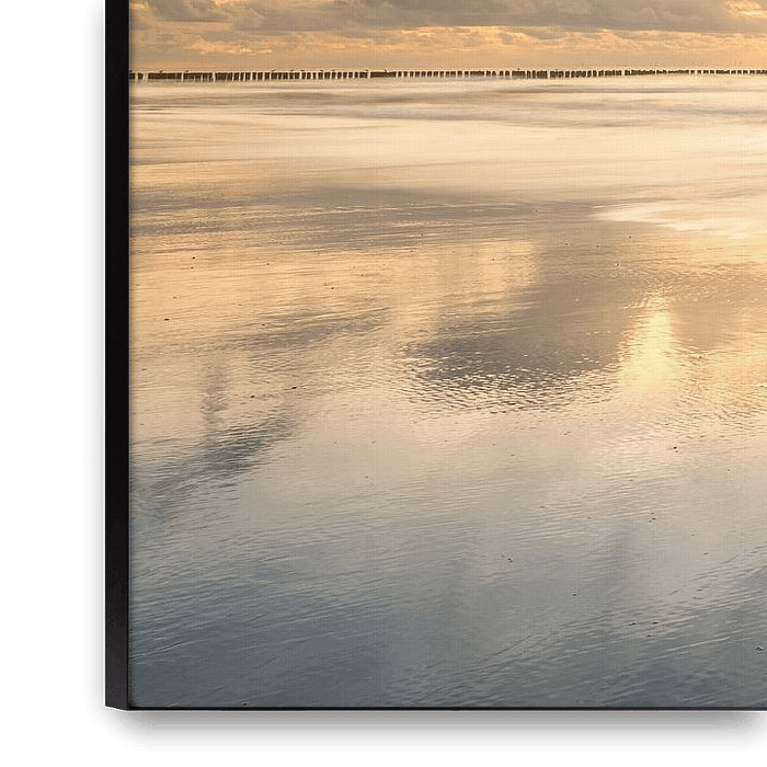 Het prachtige goudenlicht van de ondergaande zon die door de mooie wolken breekt geeft het werk een fraaie warme sfeer. De lange sluitertijd zorgt dat de golfslag mooi zacht wordt en geeft het werk een fraaie schilderachtige sfeer.