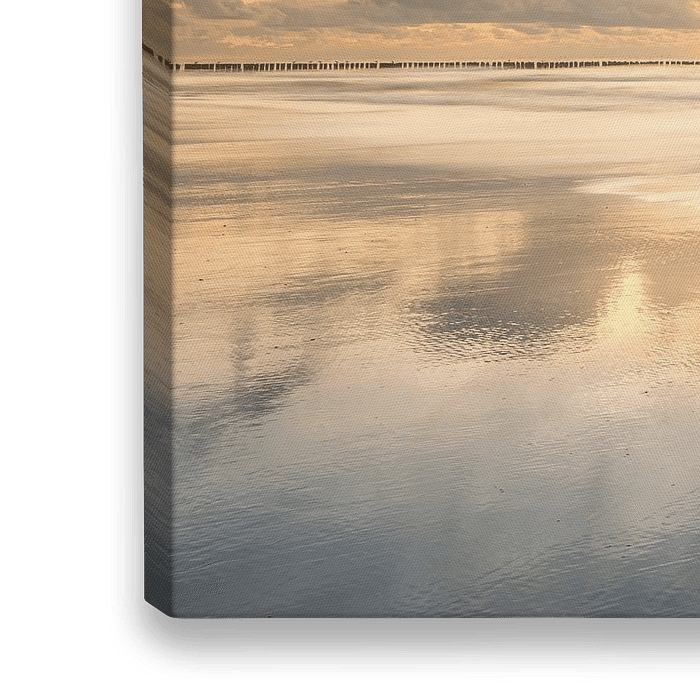 Het prachtige goudenlicht van de ondergaande zon die door de mooie wolken breekt geeft het werk een fraaie warme sfeer. De lange sluitertijd zorgt dat de golfslag mooi zacht wordt en geeft het werk een fraaie schilderachtige sfeer.