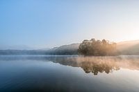 De opstijgende nevel boven het water zorgt voor fraaie zonnestralen en een mysterieuze sfeer in het werk. De prachtige blauwe lucht en het morgenrood van de opkomende zon zorgen voor fraaie kleuren in…