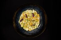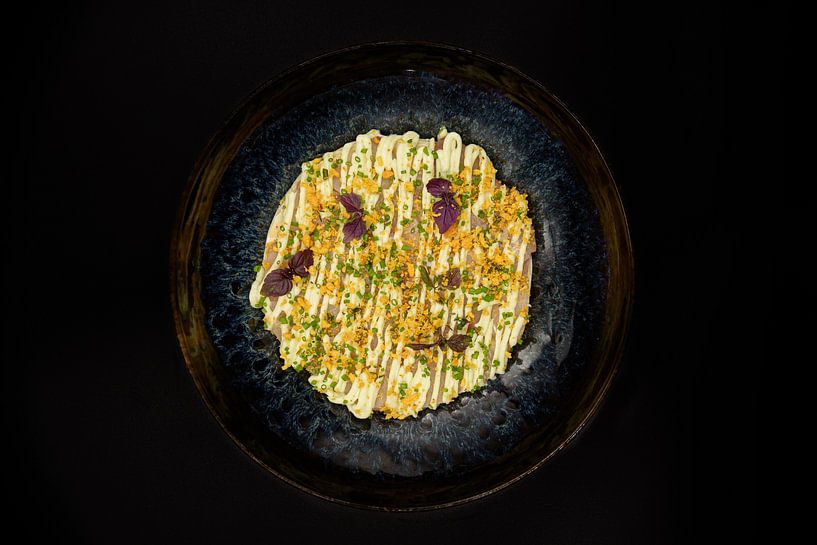 Een elegant gefotografeerd gerecht waarin kleur, vorm en structuur centraal staan. De donkere achtergrond en het warme licht geven dit foodbeeld een moderne, gastronomische uitstraling. Ideaal voor wanddecoratie in een keuken, restaurant of culinaire werkruimte.