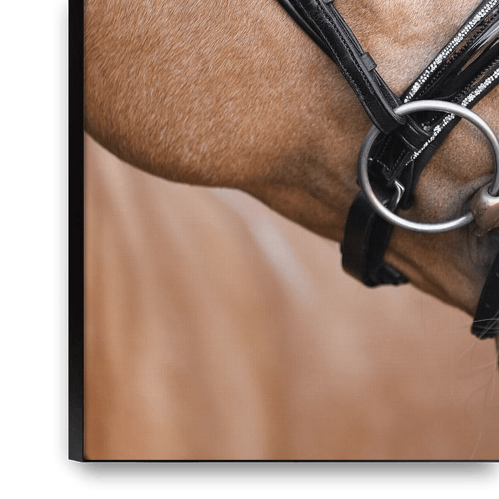Fine art print van een palomino kleurig paard, heeft een chique uitstraling door het zachte kleurgebruik en de weerspiegeling in het zwart.