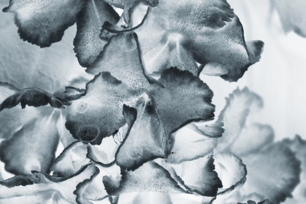 Bloemen in grijstinten waardoor de nadruk komt te liggen op vormen en structuren. Erg leuk om te experimenteren. De foto is ook in Photoshop geïnverteerd. Gemaakt in Vlindorado, een vlindertuin in Noord Holland.