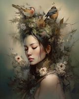 Fine art portret "Bird's nest". Bijzonder portret van een jonge vrouw met een groot vogelnest met vogels op haar hoofd. Dit werk is onderdeel van een serie. om de andere werken te zien typ je in de zoekbalk "Bird's nest". Advies: laat dit werk op dibond, aluminium of artframe afdrukken, dan komt het het best tot haar recht. Met dit werk haal je echt iets bijzonders in huis!