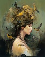 Fine art portret "Bird's nest". Bijzonder portret van een jonge vrouw met een groot vogelnest met vogels op haar hoofd. Dit werk is onderdeel van een serie. om de andere werken te zien typ je in de zoekbalk "Bird's nest". Advies: laat dit werk op dibond, aluminium of artframe afdrukken, dan komt het het best tot haar recht. Met dit werk haal je echt iets bijzonders in huis!