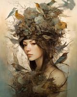 Fine art portret "Bird's nest". Bijzonder portret van een jonge vrouw met een groot vogelnest met vogels op haar hoofd. Dit werk is onderdeel van een serie. om de andere werken te zien typ je in de zoekbalk "Bird's nest". Advies: laat dit werk op dibond, aluminium of artframe afdrukken, dan komt het het best tot haar recht. Met dit werk haal je echt iets bijzonders in huis!