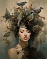 Fine art portret "Bird's nest". Bijzonder portret van een jonge vrouw met een groot vogelnest met vogels op haar hoofd. Dit werk is onderdeel van een serie. om de andere werken te zien typ je in de zoekbalk "Bird's nest". Advies: laat dit werk op dibond, aluminium of artframe afdrukken, dan komt het het best tot haar recht. Met dit werk haal je echt iets bijzonders in huis!