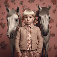 Fine art portret van een jonge jongen in pastelkleuren met twee paarden. Advies: laat dit werk afdrukken op dibond, aluminium of artframe, dan komt het het best tot zijn recht.