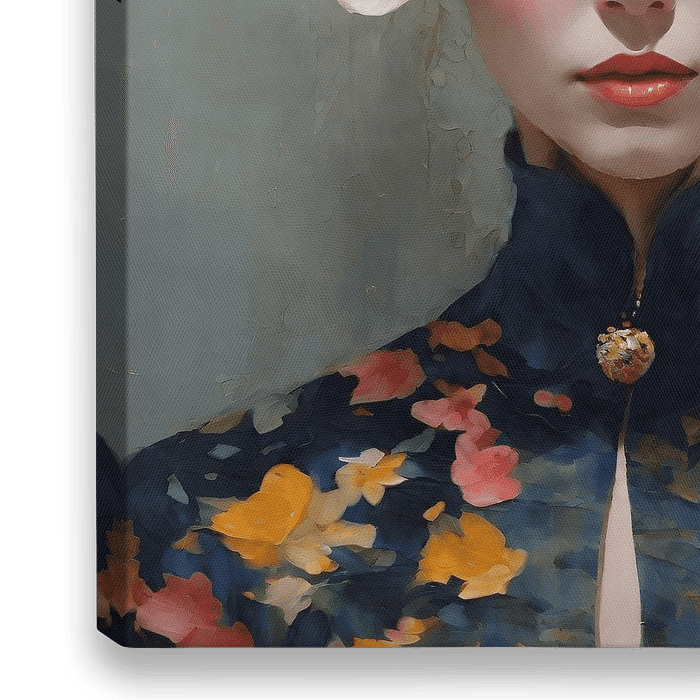 Ontdek "Elegantie," een adembenemend digitaal kunstwerk gecreëerd met olieverf. Dit betoverende portret toont een knappe, elegante jonge vrouw met gesloten ogen, gehuld in een aura van mysterie. Haar hoofd wordt gesierd door een delicate bloemenkrans, uitgevoerd in de rijke, klassieke kleuren van de oude meesters.