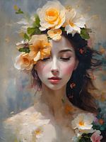 Ontdek "Elegantie," een adembenemend digitaal kunstwerk gecreëerd met olieverf. Dit betoverende portret toont een knappe, elegante jonge vrouw met gesloten ogen, gehuld in een aura van mysterie. Haar hoofd wordt gesierd door een delicate bloemenkrans, uitgevoerd in de rijke, klassieke kleuren van de oude meesters.