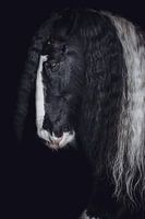Dit mooie Fine art portret siert iedere muur! Dit Tinker paard is mooi 'en profil' gefotografeerd, de lange manen en voorpluk zijn hierdoor goed zichtbaar. Het zwart-wit van het paard in combinatie met de zwarte achtergrond geeft de foto een sjieke uitstraling en het paard komt hierdoor mooi uit. Een waar kunstwerk voor aan iedere muur! Deze foto is daarnaast perfect te combineren met de andere Fine art foto's van dit paard uit deze serie.