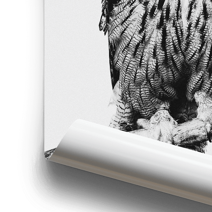 Een Fine-art portret van een grote Oehoe (uil) in Zwart wit tinten. De uil kijkt je prachtig aan met zijn doordringende ogen. Mooi als wanddecoratie op canvas of ander materiaal of bijvoorbeeld als foto poster voor aan de muur.