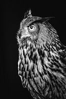 Een Fine-art portret van een grote Oehoe (uil) in Zwart wit tinten. De uil kijkt je prachtig aan met zijn doordringende ogen. Mooi als wanddecoratie op canvas of ander materiaal of bijvoorbeeld als foto poster voor aan de muur.