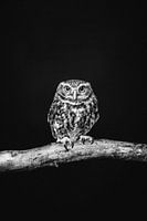 Een Fine-art portret van een kleine steenuil (uil) in Zwart wit tinten. De uil kijkt je prachtig aan met zijn grote ogen. Mooi als wanddecoratie op canvas of ander materiaal of bijvoorbeeld als foto poster voor aan de muur.