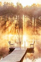 Prachtige gouden ochtendmist aan het meer in Finland.