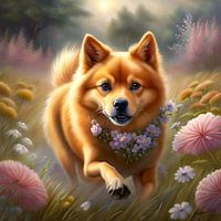 Finse Spitz spelend in een bloemenveld van Johannas Art Creations