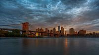 De eerste zonnestralen van de dag schijnen op de Brooklyn Bridge en wolkenkrabbers van Manhattan in New York.
