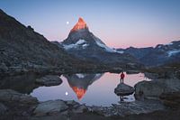 Man op een rost in de Riffelsee kijkt tijdens zonsopkomst naar het eerste licht op de Matterhorn, en de ondergaande maan.