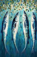 Een levendig en expressief schilderij van vier vissen die ogenschijnlijk recht omhoog zwemmen richting een abstract bladerdek. De achtergrond is geschilderd in diepe zeeblauwe tinten met groengouden accenten, terwijl de vissen in wit, blauw en een vleugje rood met stevige penseelstreken zijn neergezet. De compositie is speels en…