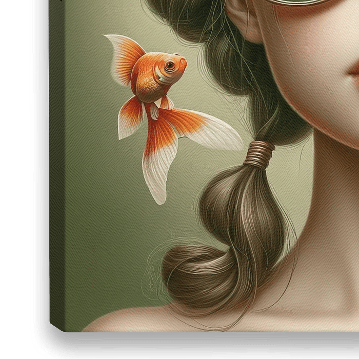 Dit is een kunstwerk met een gestileerde en surrealistische uitstraling. Het meisje heeft gevlochten haar met bloemen erin verwerkt en draagt een grote, ronde bril met een goudvissenkom effect, waarbij goudvissen in de lenzen zwemmen. Het kleurenpalet is zacht, met groenachtige en perzikkleurige tinten die het een dromerige uitstraling…