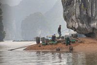 Vissers bekijken hun vangst op een klein strandje in Ha Long Bay.