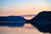 Westkaap in Noorwegen. Fjord en zee op het blauwe uur met bergen aan de kust. Ruige natuur in Scandinavië