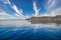 Fjord in Noorwegen. Fjord en zee met bergen en bewolkte lucht aan de kust. Ruige natuur in Scandinavië