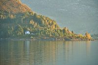 Fjord in Noorwegen. Fjord en zee bij zonsondergang met bergen aan de kust. Ruige natuur in Scandinavië