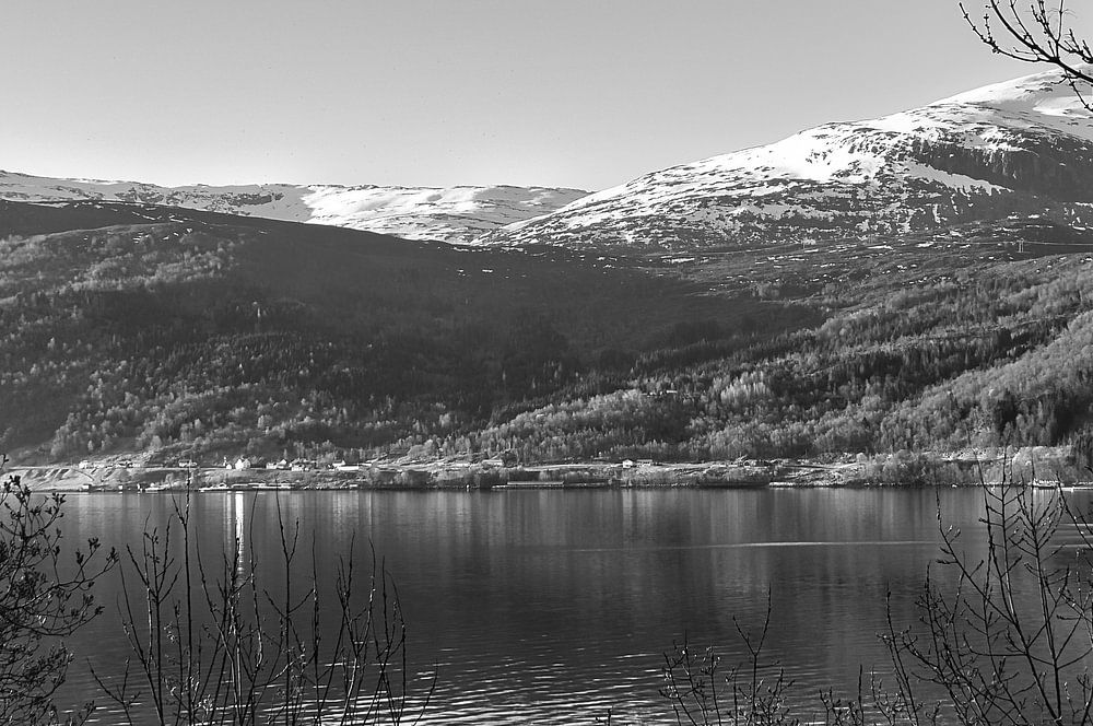Fjord in Noorwegen. Fjord en zee met bergen aan de kust in zwart-wit. Ruige natuur in Scandinavië