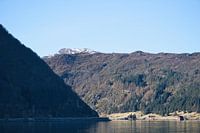 Fjord in Noorwegen. Fjord en zee met bergen en blauwe lucht aan de kust. Ruige natuur in Scandinavië