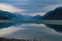 Fjord in Noorwegen, met de lucht en bergen weerspiegeld in het water.