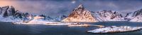 Breed panoramabeeld van de Reinefjord met Sakrisoy op de Lofoten-eilanden in Noorwegen.