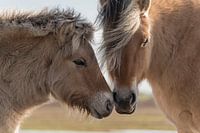 Een Fjord, Fjordenpaard, met haar veulen in natuurgebied Slikken van Flakkee in de provincie Zuid-Holland, op het eiland Goeree-Overflakkee in Nederland. Het Fjord is een paardenras uit Noorwegen. Het is één van de oudste en zuiverste rassen ter wereld.